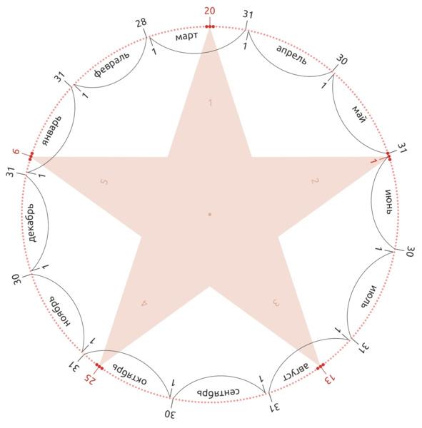 Дополнительно отметим ещё несколько моментов. Даты проведения ритуалов по пятиконечной Звезде Ярилы: