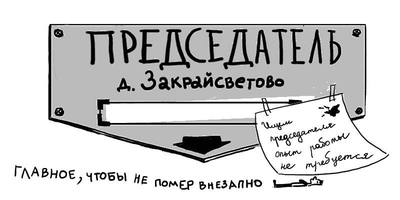 Он поднял глаза и посмотрел на двухэтажное здание, к которому он пришел, сам того не заметив. У двери висела невзрачная табличка, на которой было написано: «Администрация деревни Закрайсветово», а ниже небольшое объявление: «Ищем председателя. Опыт работы не обязателен. Желательно молодого, чтоб не помер внезапно».