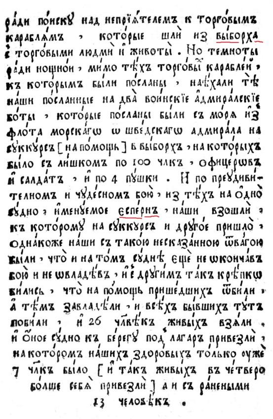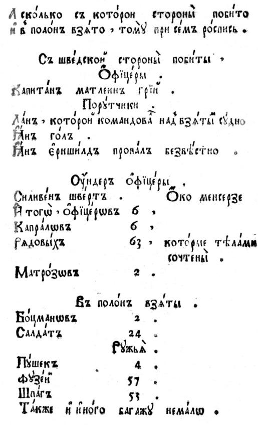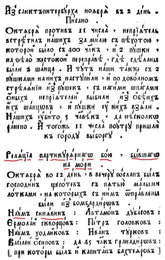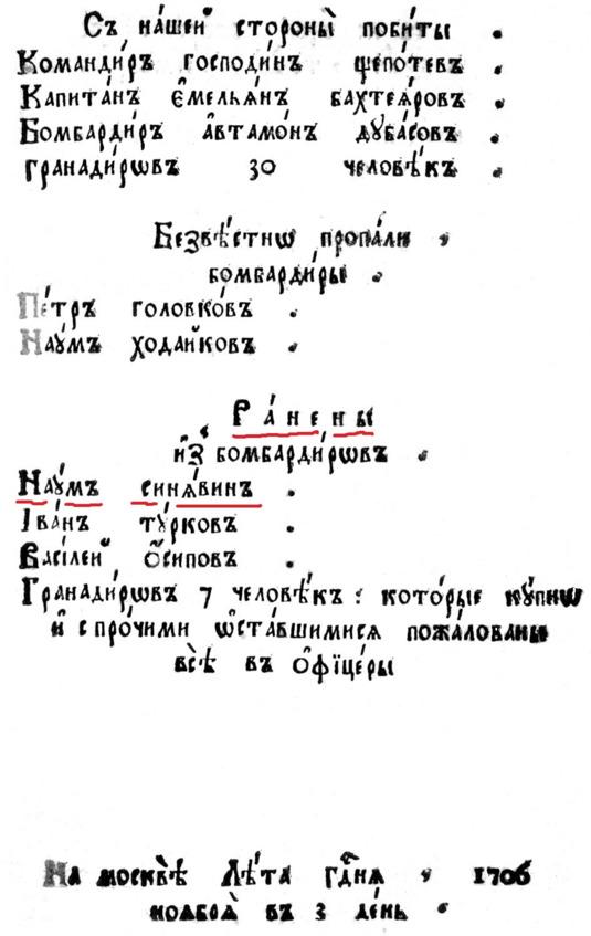Одной из лодок командовал бомбардир Наум Синявин. Наши после двухчасовой напряжённой гребле в ночи подошли к шведскому транспорту. Щепотьев дал команду атаковать ближайший. Началась ожесточенная абордажная схватка, в которой обе стороны понесли значительные потери. В итоге вооруженный четырьмя мелкокалиберными пушками бот «Эсперн» был взят на абордаж. Преображенцы числом 37 человек, включая Михаила Щепотьева, погибли. Потери шведов насчитывали более 70 человек. Гвардейцы не только захватили вражеский транспортный корабль, но и смогли после этого отбить нападение другого шведского бота, пришедшего на выручку «Эсперну». Сам Наум Синявин, показавший себя исключительно храбрым человеком, в этой схватке получил боевую рану «в руку пулею на вылет». После выздоровления он продолжил службу уже в звании боцман. Про этот бой сказано в другом документе «Реляции партикулярного боя на море 1706 года». Эта реляция ранее никогда не показывалась и была только в архивах. В данной книге впервые я её опубликую. Читайте по оригинальным снимкам ниже по тексту. Это очень интересно углубиться в чтение новостей, которые были написаны более 300 лет назад. В том бою в живых осталось всего 18 солдат, в том числе 4 раненых. Бомбардир Наум Синявин «раненый в руку пулею на вылет» выжил в этой бойне.