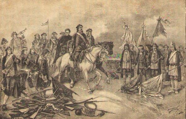 В «Истории Лейб-Гвардии Преображенского полка» про этот момент сказано: «…шведы представляли нестройную толпу бегущих, беспощадно уничтожаемую Русскими: 4 орудия, 137 знамен и штандартов, до 4000 пленных, обоз и шведский лагерь достались победителям. К полудню все было кончено и шведская армия, столь грозная прежними своими победами, почти не существовала».