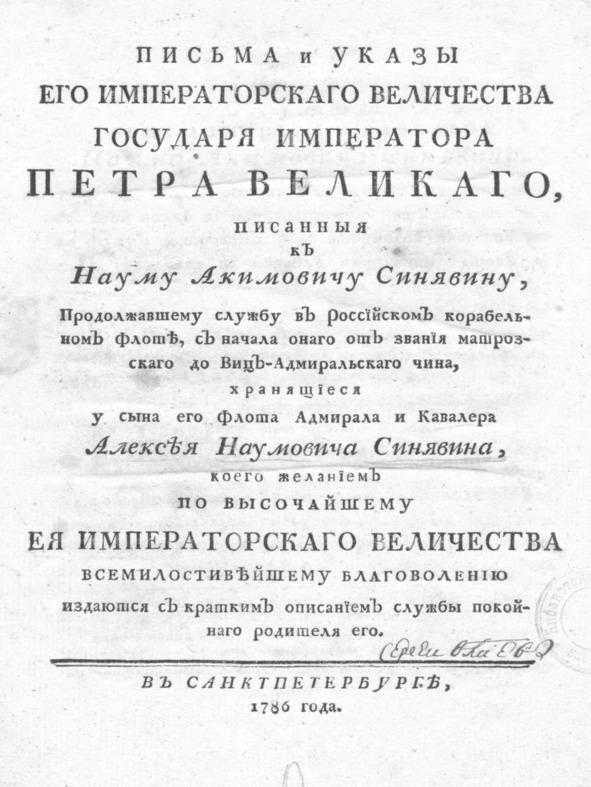 В июле Государь пишет первое сохранившееся в архивах письмо Науму Синявину от Днестра. Порутчик Наум Синявин был отправлен в Ярославль. Приведу его полностью: «Господин порутчик! По получению сего поезжайте вы с Мухановым в Ярославль, наперёд взяв с собою у господина подполковника Долгорукова солдат и приехав туда уберите суды, которыя там велено сыскать посланным офицерам Караулову и Дурасову, которые посланы от генерал-майора Гешова, а имянно: осьмнадцать, чтобы они были на воде и к ходу во всякой готовности. Чтобы нам за тем в Ярославль не было мешкоты и особливо из тех судов у двух сделайте каюты, с перегородками и с нужниками, так как прежде было сделано на Нашем судне. когда мы плыли Вислою от Солнцы до Таруни». Подписано «Пётр» подлинной рукой Его Имераторского Величества.