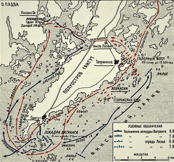 25 апреля 1714 года неприятельская эскадра в составе 16 линейных кораблей, 2 бригантин, двух бомбардирских кораблей, 8 галер и других судов заняла позицию у полуострова Гангут, чтобы преградить русскому галерному флоту путь в Або-Аландские шхеры. Наш галерный флот, за которым следовали провиантские суда, после остановки у Березовых островов 31 мая вошел в шхеры, и только 11 июня он достиг Гельсингфорса, так как сильные встречные ветры мешали его быстрому движению. У Гельсингфорса галерный флот простоял до 21 июня. Здесь была произведена выгрузка на берег провианта для сухопутной армии, действовавшей в Финляндии под командованием Михаила Голицына.