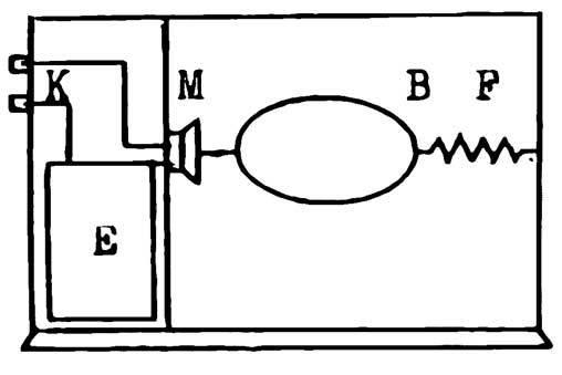 Рисунок 3.2. Психотелефон Мелтона, где F – пружина, B – надувной баллон, E – батарея, K – выход на наушники, M – мембрана