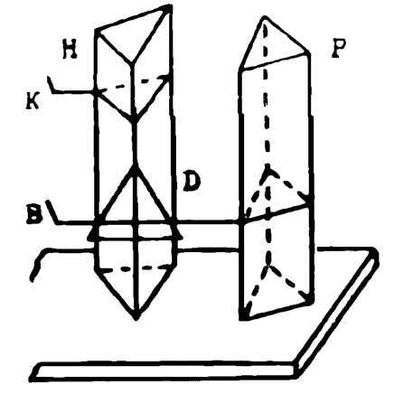 Рисунок 3.3. Устройство Вандермюлена, где P – стеклянная призма, H – стеклянная призма, покрытая смолой, D – проволочная треугольная рамка, K – к звонку, B – батарея