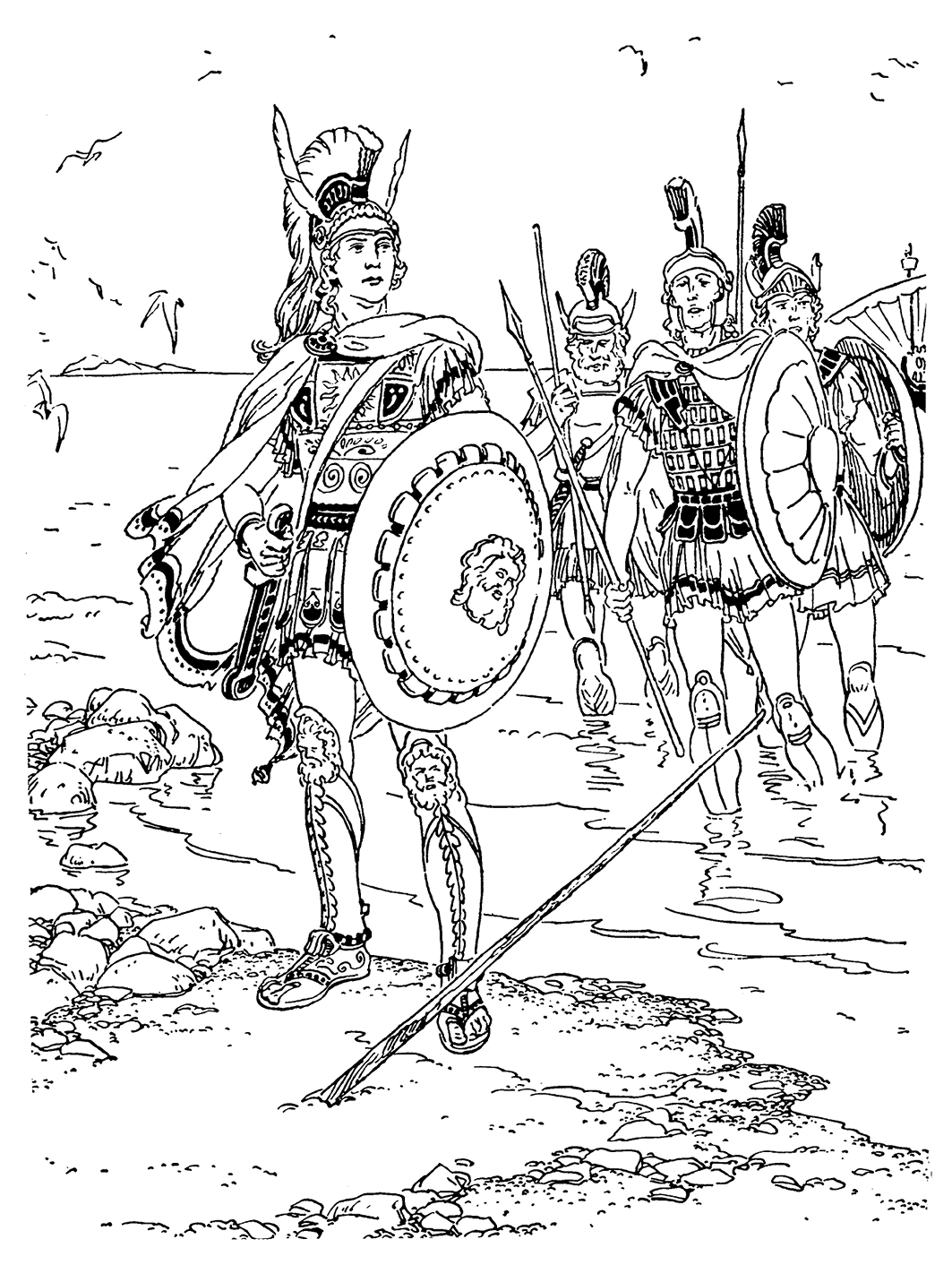 Царская триера шла впереди. Александр сам стоял у руля. Он был в полном боевом снаряжении — в доспехах, в шлеме, в бронзовых поножах, надежно защищающих ноги. Рядом, прислоненное к борту, светилось синим блеском железное жало его тяжелого копья.