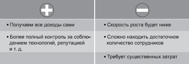 Хотя здесь сразу заметен и ощутимый минус – доходов вы будете получать существенно меньше, чем если бы это был ваш собственный филиал. Однако что важнее именно для вас: грамотно построить франшизу, получая стабильный доход, или жадничать, открывая свои филиалы в регионах?