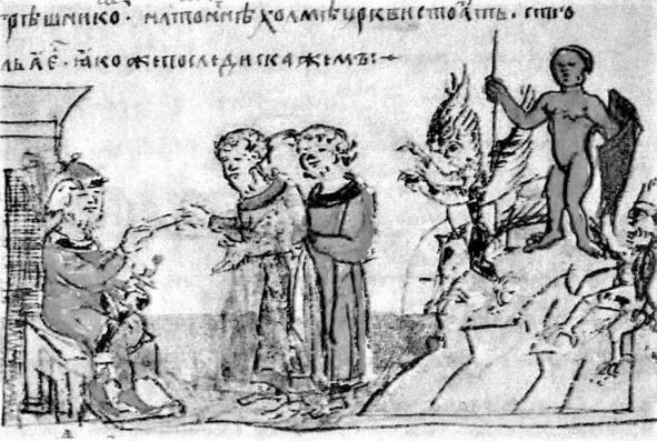 На миниатюре Перун совсем не «страшный деревянный идол», а больше напоминает ангела, разгоняющего крылатых бесов, правда и суровый Добрыня изображен очень милым и ласковым. Но для нас здесь важнее атрибуты Перуна: короткое копье или стрела, которая является общепризнанным символом бога-громовержца, и щит, про который в литературе как атрибуте Перуна вообще почти ничего не сообщается. То, что Перун держит в ру