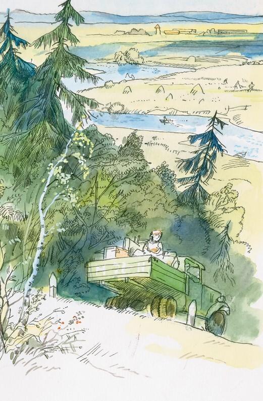 Грузовик мчался по широкой солнечной дороге. Поставив ноги на чемодан и опираясь на мягкий узел, Ольга сидела в плетеном кресле. На коленях у нее лежал рыжий котенок и теребил лапами букет васильков.