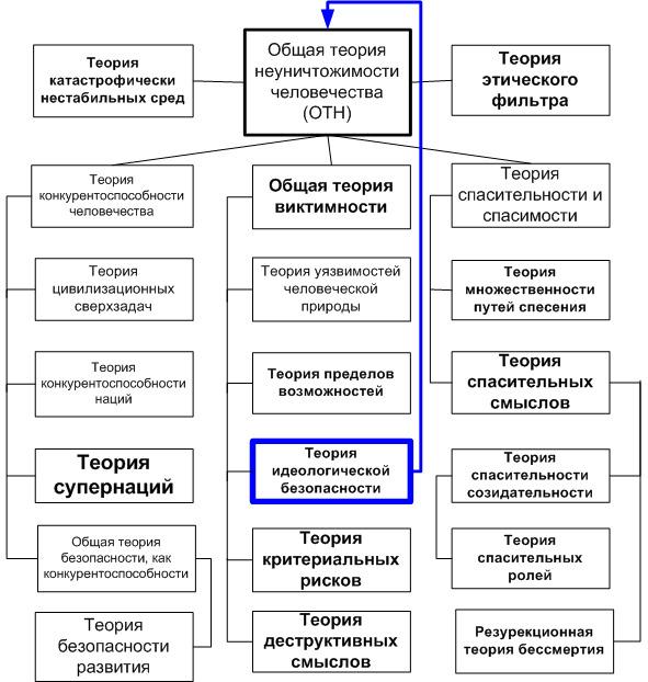 Александр Кононов: Общая теория в моем понимании та, которая определяет основные задачи и проблемы широкомасштабных исследований, а также определяет общие принципы и подходы, которые должны при этом применяться. Специальные теории, предназначены для отражения детальных исследований отдельных проблем и задач, требующих специальных, специфических подходов и методов. Что касается проблематики фундаментальных проблем безопасности и, в частности, проблем цивилизационной безопасности, то тут такое безбрежное поле неисследованных проблем… Вообще, по-хорошему, исследование фундаментальных проблем безопасности должно быть выделено в отдельную отрасль науки. Но я прекрасно понимаю, насколько инертен научный истеблишмент, тем более что зачастую блестящие ученые в своих областях бывают абсолютно невежественными в других. Человеку трудно объять необъятное, особенно, если он глубоко погружается в какую-либо свою узкую специальную область. Ну и так получилось, что в проблематике фундаментальной цивилизационной безопасности, количество неисследованных проблем настолько велико, что просто, чтобы закрыть только те проблемы, без которых мы не могли развивать нашу теорию, пришлось выстраивать вот такую иерархическую систему из теорий, в которой отдельные специальные теории в контексте #ОТНМ обращались в свою очередь в теории определяющие общие задачи и подходы, которые уже детализировались в более специальных и детальных исследовательских теориях. Иногда спрашивают, а нельзя ли было просто все это делать не на таком множестве теорий, а определяя разделы исследований в рамках одной теории. Но тогда бы пропала автономность, возможность развивать отдельные теории безотносительно того, как они связаны с вышестоящими в рамках иерархии #ОТНМ теориями, а это тоже очень важно. Например, теория идеологической безопасности. Она может развиваться совершенно самостоятельно. Но, в любом случае, ее результаты чрезвычайно важны для общей теории неуничтожимости человечества, поскольку только через смыслы и идеологии можно как консолидировать человечество во имя задач его спасения, так и вовлекать в самоистребительные войны. И также для всех остальных теорий. В принципе, если когда-нибудь все-таки здравый смысл возобладает и появится такая самостоятельная отрасль науки, как фундаментальная теория безопасности (ФТБ), то многие теории могут быть выведены из #ОТНМ и войти в ФТБ на равноправных правах с теорией цивилизационной безопасности или #ОТНМ. В общем, ответ такой: слава Богу, что Эйнштейну удалось уложиться в две теории. Но вот для #ОТНМ потребовалась на сегодняшний день 21.