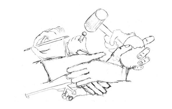 Руки руками, но инструменты — их основное продолжение. Большое многообразие разработано для каждой хирургической специальности и для каждой операции. Например, у травматологов много инструментов, похожих на столярные и слесарные: молотки, остеотомы (стамески), дрели, пилы, пластины, шурупы… Но и объекты их операций очень плотные — кости, суставы, связки… А сопоставить перелом так, чтобы на рентгеновском снимке оставалась только тонкая полоска, тоже уметь надо. «Самосвал триста тысяч кило мне скелет раздробил на кусочки». Это тоже Высоцкий. Более изящные инструменты у микрохирургов. Пинцеты, больше похожие на две иголки. Мининожницы, маленькие иглы и нити, тоньше волоса. Объекты соответствующие — кровеносные сосуды диаметром от одного до трёх миллиметров, нервы с их пучками, лимфатические сосуды… Сколько нежных микроинструментов погибло просто после падения на кончики. Удивительная техника у нейрохирургов, сначала они травматологи, потом микрохирурги. Инструменты у них и такие, и такие… А детские хирурги? Техника детских хирургов более тонкая и нежная. Их пациенты — дети. Это ко многому обязывает. Юрий Андреевич Козлов своими руками может полностью закрыть новорождённого пациента. Но у этих рук есть продолжение — изящные эндоскопические инструменты, которыми он чудеса творит!