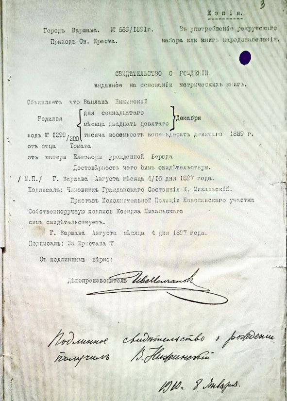 Но вот копия Свидетельства (№669/1891 г., город Варшава, приход Св. Креста) о рождении Вацлава Нижинского, выданное на основе метрических книг. Копия выдана 4 (16) августа 1897 года. В этом документе, официальной датой его рождения является 17 (29) декабря 1889 года, а место рождения — Варшава. Как же так?
