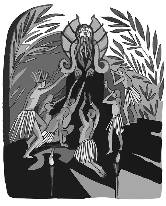 Then, whispered Castro, those first men formed the cult around small idols which the Great Ones shewed them; idols brought in dim aeras from dark stars. That cult would never die till the stars came right again, and the secret priests would take great Cthulhu from His tomb to revive His subjects and resume His rule of earth. The time would be easy to know, for then mankind would have become as the Great Old Ones; free and wild and beyond good and evil, with laws and morals thrown aside and all men shouting and killing and revelling in joy. Then the liberated Old Ones would teach them new ways to shout and kill and revel and enjoy themselves, and all the earth would flame with a holocaust of ecstasy and freedom. Meanwhile the cult, by appropriate rites, must keep alive the memory of those ancient ways and shadow forth the prophecy of their return.