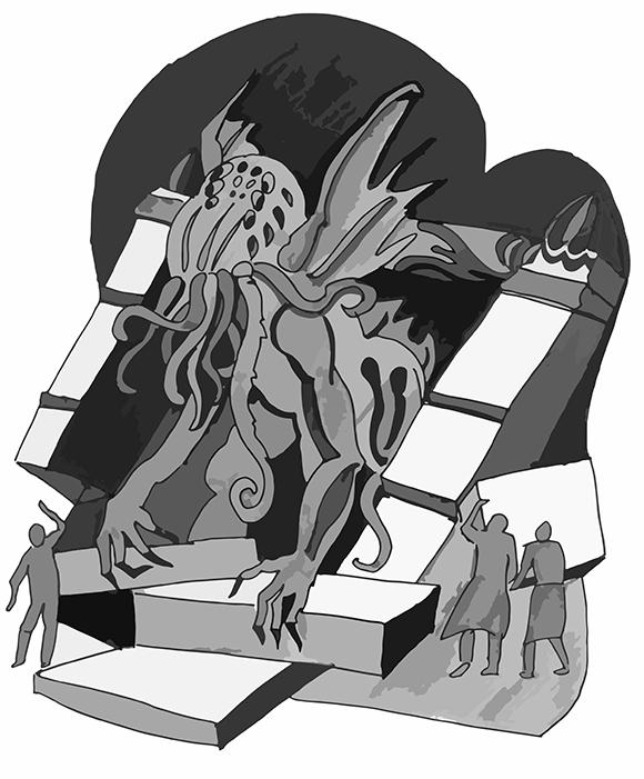It was then that he began that rambling tale which suddenly played upon a sleeping memory and won the fevered interest of my uncle. There had been a slight earthquake tremor the night before, the most considerable felt in New England for some years; and Wilcox’s imagination had been keenly affected. Upon retiring, he had had an unprecedented dream of great Cyclopean cities of titan blocks and sky-flung monoliths, all dripping with green ooze and sinister with latent horror. Hieroglyphics had covered the walls and pillars, and from some undetermined point below had come a voice that was not a voice; a chaotic sensation which only fancy could transmute into sound, but which he attempted to render by the almost unpronounceable jumble of letters, “Cthulhu fhtagn”.