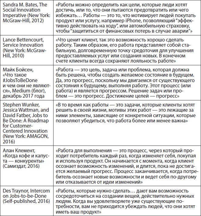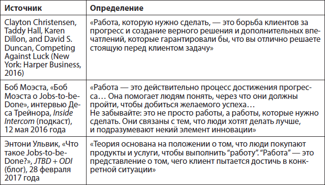 Хотя современная литература о JTBD восходит к Кристенсену, на практике определения JTBD различаются. В табл. 1.1 в конце главы вы можете увидеть, как авторитетные эксперты отрасли определяют термин «работа». Сравнение дефиниций демонстрирует различия подходов, одновременно выявляя их общность.