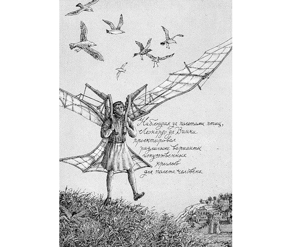 Великий итальянец Леонардо да Винчи считается первым конструктором геликоптера, парашюта, орнитоптера и многих других машин, инструментов, приборов. Легенды о гениальном Леонардо – смесь правды, домысла и вымысла – закономерно повторяются почти в каждой книге о нем. Есть сведения неоспоримые – скульптура, живопись, рисунки. Леонардо да Винчи как конструктор и инженер – загадка потруднее. Современники видели в нем прежде всего гениального художника, об инженерном наследии Леонардо люди узнали в основном по его записям, много лет спустя после его смерти.