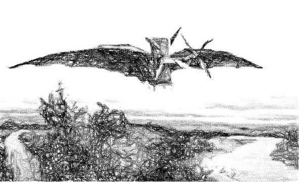 Полотно летающих пластинок может быть сплошное или не сплошное, но каждое из них имеет отдельную упругую опушку, как крылья у птиц. Такое устройство выгодно в том отношении, что движение всякого ветра – бокового, диагонального и тыльного, шевеля опушку рычагов, представляемых упомянутыми ребрами, легко преобразовывается в поступательный полет самолета.