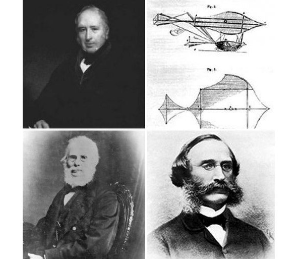 (сверху-вниз, слева-направо) 1. Сэр Джордж Кейли. 2.«Воздушная повозка» Джорджа Кейли. 3. Джон Стрингфелло 4.Вильям Генсон