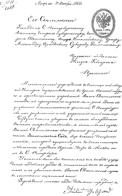 Прошение Ю. Гебгарта о разрешении на строительство зоосада. 1864 год