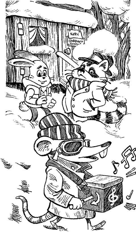 Заяц недоверчиво осмотрел енота, засыпанного снегом, и хотел было спросить, почему тот такой хмурый. Но внезапно из-за угла вынырнула незнакомая фигура и послышалась грустная песня.