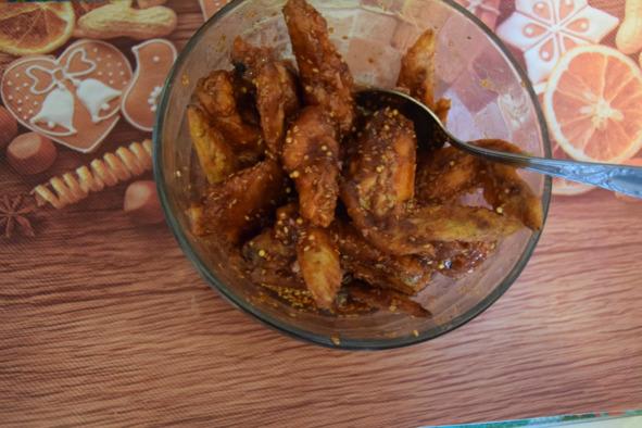 Выкладываю крылья в салатницу с соусом и перемешиваю, чтобы каждое крыло покрылось ароматной налипающей кисло-сладкой глазурью.