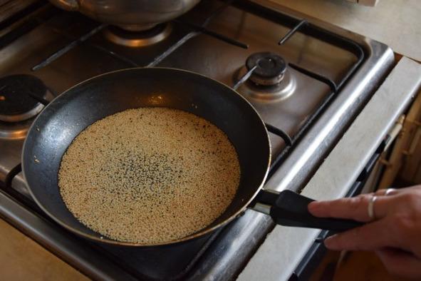 Я взяла кунжут (пачку) и хорошенько прогрела его на сковороде с подсолнечным маслом.