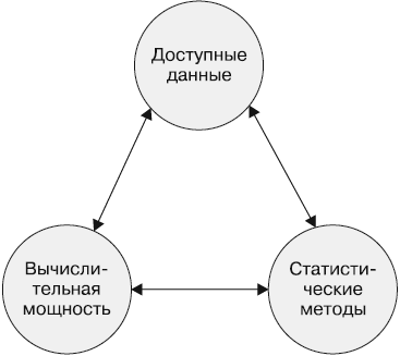Область исследования, занимающаяся созданием компьютерных алгоритмов для преобразования данных в обоснованные действия, называется машинным обучением. Эта область возникла в среде, где доступные данные, статистические методы и вычислительные мощности развивались быстро и одновременно. Рост объемов данных потребовал дополнительных вычислительных мощностей, что, в свою очередь, стимулировало разработку статистических методов анализа больших наборов данных. Это породило цикл развития (схематично представлен на рис. 1.1), позволивший собирать все больше интересных данных и сформировавший современную среду, в которой практически по любой теме доступны бесконечные потоки данных.