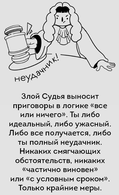 Злой Судья выносит приговоры в логике «все или ничего». Ты либо идеальный, либо ужасный. Либо все получается, либо ты полный неудачник. Никаких смягчающих обстоятельств, никаких «частично виновен» или «с условным сроком». Только крайние меры.
