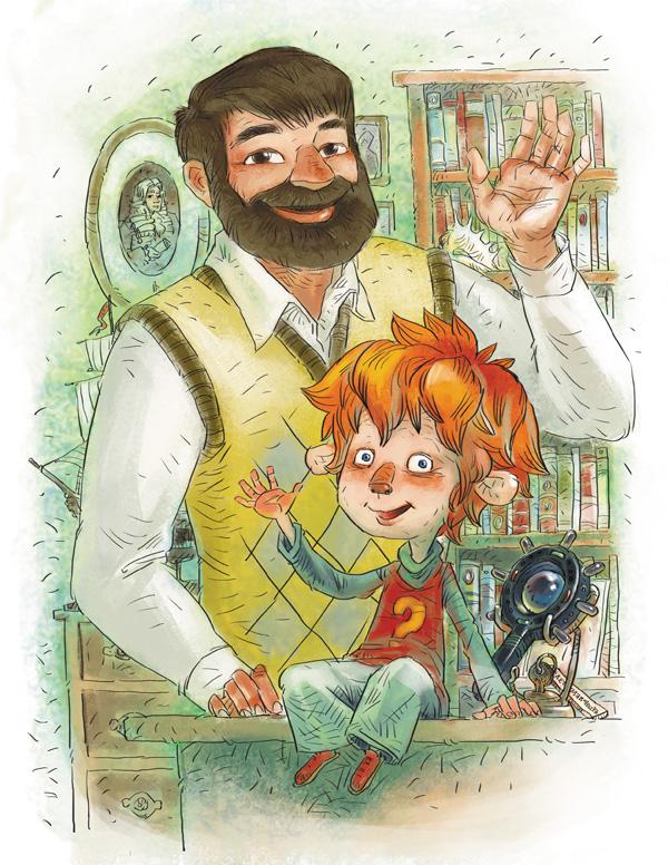 Здравствуйте, ребята! Меня зовут Чевостик. Я живу на книжной полке в библиотеке у дяди Кузи. Не удивляйтесь, я небольшого роста, а нижняя полка в книжном шкафу дяди Кузи очень высокая и просторная, поэтому мне на ней хорошо и удобно. Какой я? Похож на обыкновенного мальчишку, волосы рыжие, характер весёлый. Дядя Кузя в шутку зовёт меня Чевочка с хвостиком. Но никакого хвоста у меня нет, зато есть ушки на макушке. Больше всего на свете я люблю узнавать новое, поэтому всё время задаю всякие вопросы дяде Кузе. О чём бы я ни спросил, он всё знает и мне рассказывает. Это потому, что дядя Кузя очень умный. Он прочитал много-много разных книг. А ещё мы с ним любим путешествовать! В путешествиях нам помогает времяскок. Это такой прибор, его дядя Кузя изобрёл. Набираешь на времяскоке место и время, куда хочешь попасть, раз, два — и уже там! Сегодня мы наверняка тоже куда-нибудь отправимся!