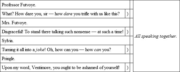 Mr. Ventimore don't seem to be in, after all, sir. Unless he's in his bedroom. [She comes down to the door on right, as Professor, Mrs., and Miss Futvoye enter from the other door. Professor Futvoye is elderly and crabbed; his wife, grey-haired and placid, bearing with him as with an elderly and rather troublesome child; Sylvia Futvoye, their daughter, is a pretty and attractive girl of about twenty. Mrs. Rapkin knocks at the bedroom door.] Mr. Ventimore! A gentleman and two ladies to see you. [She opens the door – then, to the Professor.] No, sir, he hasn't come in yet – but he won't be long now.
