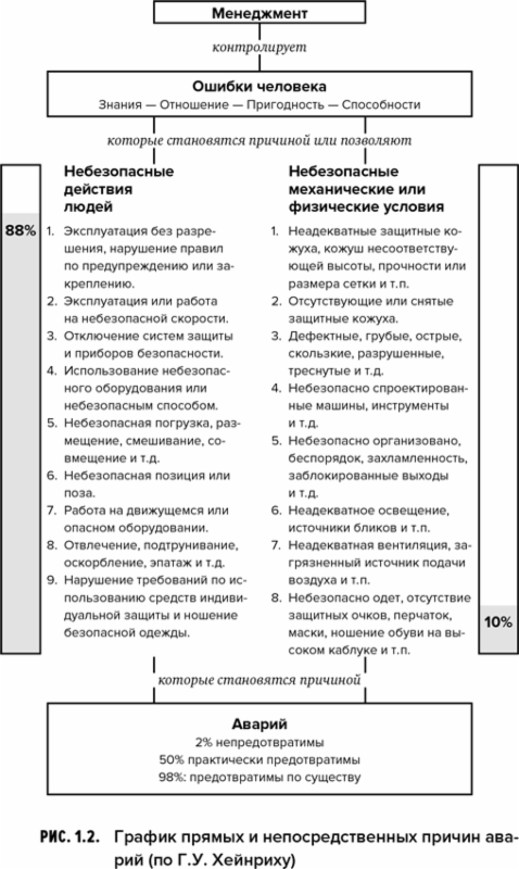 Следующий тезис, который важен для предмета нашей книги и который был высказан Г. У. Хейнрихом, заключается в том, что основной причиной (88%) несчастных случаев на рабочем месте являются небезопасные действия работника — как правило, самого́ пострадавшего. Этот тезис позволил работодателям и консультантам неизменно утверждать: во всем виноват работник (рис. 1.2).