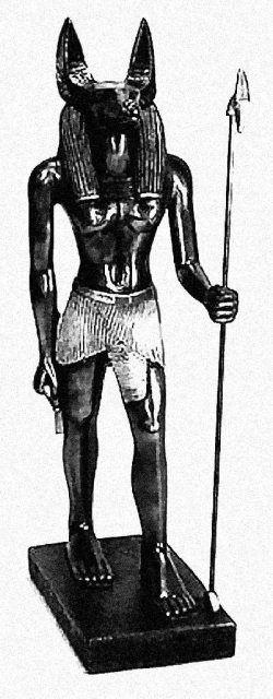 Анубис – бог бальзамирования, владыка древнеегипетского некрополя, проводник душ умерших. В ранний период изображался как шакал, лежащий на брюхе с поднятой головой, затем – как человек с головой собаки;