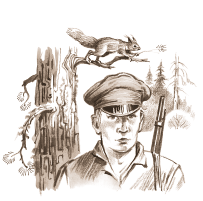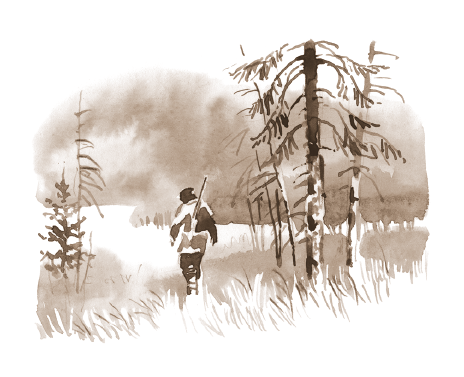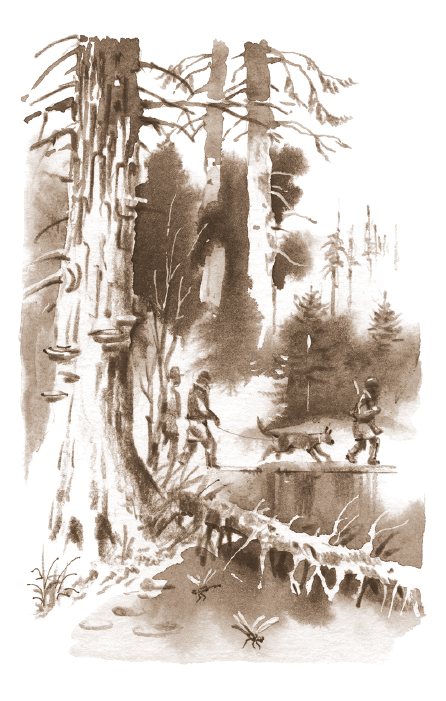 Дремучая, таинственная тайга возбуждала у людей страх перед чем-то неизвестным, что скрывается в ее глубине. Тайга казалась молчаливой и мрачной, но внимательный взгляд охотников ежеминутно раскрывал всё новые ее тайны. У тропинки под поваленным стволом дерева они открыли медвежью берлогу. Чуть дальше, на небольшом холмике, устроился жадный бурундук, один из самых маленьких в мире грызунов. На высохших ветвях сваленного дуба он сушил свои лакомства: грибы, коренья и орехи, запасы которых делал по крайней мере на два года вперед. Дальше, за холмом, вилась тропинка, протоптанная оленями; в дупле раскидистой липы пчелиный рой, — вероятно, там можно было найти ароматный лесной мед.