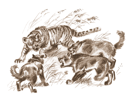 Наконец охотники настигли хищника. Опершись задом о поросшую мохом кучу бурелома, тигр острыми клыками или лапой то и дело пытался достать одного из наседавших псов. Собаки выглядели столь же дико, как и загнанный зверь. Они нападали на него то с боков, то спереди. Их темная, как у волков, шерсть взъерошилась и взлохматилась. Ослепленные охотничьей страстью, псы не обращали внимания на полученные раны. Глаза собак горели кровавым огнем. Отскакивая от внезапного удара лап тигра, они поджимали длинные пушистые хвосты, но тут же, напрягаясь всем телом, готовились к новому прыжку, обнажая острые клыки в широко раскрытых пастях.