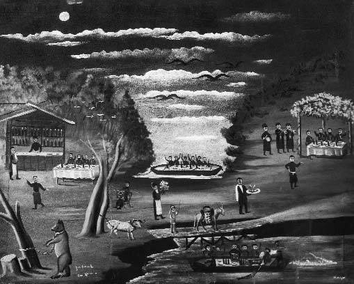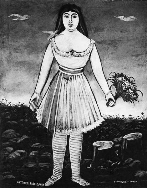 Если обратиться к искусству Пиросмани, то в нем легко обнаружить много сходных черт и формальных приемов, перекликающихся с Анри Руссо. В отличие от Руссо, Пиросмани не просто видел перед собой вывески, объявления и живописные «карточки». Он продолжал расписывать вывески, уличные фонари и стены трактиров до конца дней, но все это отнюдь не свидетельствует о его «примитивности». Факты жизни Пиросмани почти не известны. Не дошли до нас и его высказывания об искусстве. Мы не знаем, писал ли он стихи, как А. Руссо, или философские опусы, как Чонтвари. Если некоторые, по-видимому, ранние его работы, такие как Ишачий мост, несут в себе явные признаки простодушного, описательного лубка, уподобляющего мир топографической план-карте и потому не считающегося с законами перспективного построения и наносящего на эту карту в разных местах возможные достопримечательности, то в зрелых картинах мастера перед нами разворачивается необъятная по охвату панорама мироздания, картина вселенной, образ плодоносящей земли, неотъемлемой принадлежностью которой, одним из ее элементов является человек. Горожанин Руссо, безусловно, не мог выбрать такой темы. Однако, как и Руссо, Пиросмани воссоздает свою, исполненную творческой энергии картину мира на языке лубка, хотя его решение темы уже не несет в себе ничего наивного. Не менее сильны монументальные возможности языка Пиросмани в знаменитом «большом натюрморте» так же, как и большинство его картин, написанных на специально выбиравшейся художником черной клеенке. В основе натюрморта лежит трактирная вывеска, но каждый из изображенных на ней предметов исполнен напряжения, экспрессии, сродни одушевленным видам в натюрмортах Ван Гога. Те же предметы застывают перед столом с накрытой трапезой в картине Компания Бего. Их роль в этой композиции двойственна, как и функция самой картины. С одной стороны, перед нами изображение излюбленного Пиросмани мотива празднества, кутежа. Но застывшие персонажи с неподвижными, серьезными лицами, сидящие за накрытым столом, блюда, расставленные на девственно чистой скатерти, к которым никто не смеет прикоснуться; руки гостей, поднятые в торжественном жесте и демонстрирующие зрителю сосуды для вина и рыбу, как бы отделившуюся от многочисленных предметов натюрморта на переднем плане; окаменевший духанщик с кувшином вина в одной руке и полотенцем в другой намекают на то, что перед нами изображена не просто жизненная сценка в трактире, но ритуальное действо, не кутеж, но трапеза. И одновременно эта самая настоящая вывеска и торжественно разложенные предметы перед столом так же, как и надпись вверху на небе, – ее непреложные атрибуты. Прикладная эмблематичность вывески так же, как и для Анри Руссо, стала для Пиросмани символом, знаком вечности. Этими же чертами отмечены и преобразованные спецификой восприятия Пиросмани портреты-«картинки». Как и в случае со Свадебным портретом А. Руссо, здесь следует усомниться, все ли он их писал по заказу. Неподвижно застывший в воде рыбак или крестьянка с детьми, идущая к источнику, неожиданно увиденные воображением художника, скорее всего, написанные по собственной внутренней потребности остановить быстро текущее время, обнаружив в нем мотив вечности. Можно сказать, что в картинах, подобных Крестьянке с детьми, идущей за водой, Пир