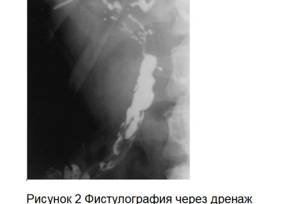 В ходе фистулографии через дренаж холедоха желчное дерево не контрастировалось, в тоже время контраст, введённый в дренаж, по которому отделялась желчь, позволил идентифицировать внутрипеченочные желчные протоки.