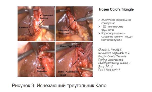 В англоязычной литературе существует термин «Frozen Calot’s triangle» (замороженный треугольник Кало) — это состояние при холецистэктомии, когда критически затруднено рассечение тканей в зоне треугольника Кало из-за выраженного фиброза в результате повторных эпизодов воспаления. Жировая ткань заменяется рубцовой.