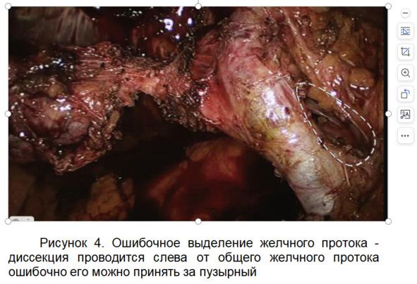 Данная фотография (рисунок 4) — пример ошибки, которая потенциально угрожает развитием классического повреждения. Если вы присмотритесь к изображению, то будет видно, что обведённое пунктиром «окно» находится кнаружи от общего желчного протока, в то время как пузырный проток находится левее и отходит от общего желчного к шейке пузыря под углом 45 градусов.