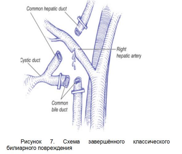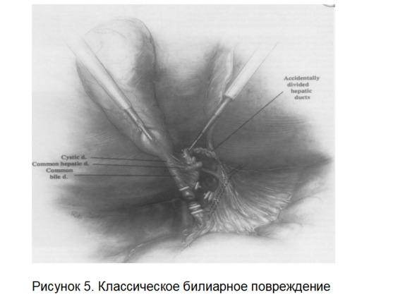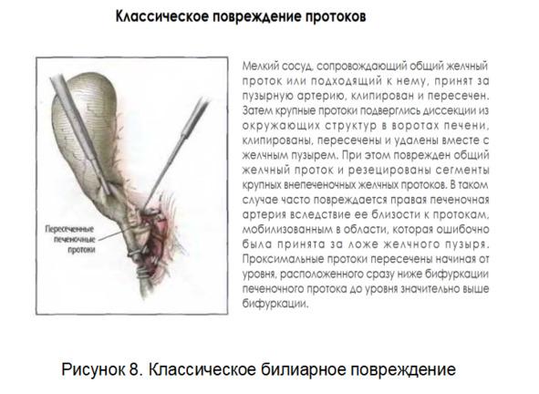«Наиболее серьёзную опасность представляет вариант, когда при исходно коротком пузырном протоке в результате рубцового процесса к задней стенке шейки пузыря подтягивается стенка общего печёночного протока… Тракция шейки пузыря вытягивает общий желчный проток, который хирург лигирует и пересекает принимая его за d. сisticus. Осознание трагедии происходит позже в процессе выделения пузыря, когда хирург, вдруг обнаруживает проксимальную часть гепатохоледоха. По данным исследований ряда Американских центров, такой механизм повреждения при использовании американской техники является наиболее распространенным и назван «классическим повреждением».