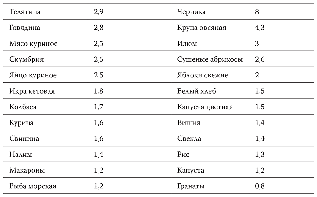 Впрочем, не надо думать, что орехи и овсянка могут полностью заменить мясо. Дело в том, что здесь указано абсолютное содержание железа в продуктах, но всасывается оно далеко не полностью. Например, из мяса всасывается около 20 % железа, а из растительных продуктов – только 5–10 %. И наконец, обратите внимание, что красный цвет продуктов совершенно не гарантирует высокое содержание железа. До слез умиляет желание накормить человека, сдавшего кровь на донорском пункте, свекольным салатом, гранатом и напоить красным вином со словами: «Тебе надо гемоглобин восстанавливать». Нет в этих продуктах железа, почти совсем нет.