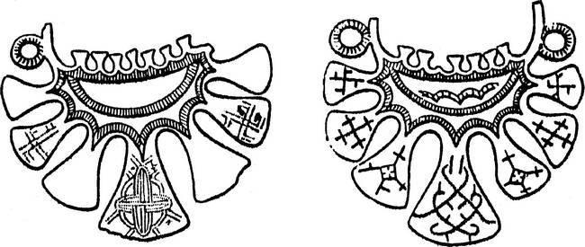 В женских захоронениях найдено более ста предметов украшений около сорока наименований: ожерелье и отдельные бусины сердоликовые и хрустальные, перстни витые, решетчатые, пластинчатые, рубчатые, браслеты витые и пластинчатые, кольцо поясное, гривны, крест каменный – символ благополучия на все четыре стороны и, конечно, семилопастные височные кольца. Височные кольца были разные: медные и серебряные, в большинстве без орнамента и только два кольца – у женского погребения в кургане № 8 – с орнаментом7.