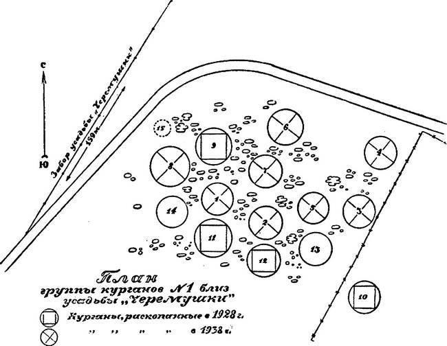 План расположения группы курганов № 1 в усадьбе Знаменское Черёмушки при раскопках 1928 и 1938 гг.