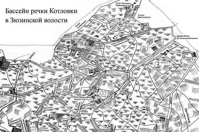 Забудем на время нынешние границы, познакомимся со всеми владениями, возникшими на территории Котельского бассейна: села Никольское, Троицкое Черёмошки тож, Знаменское Черёмошки тож, Зюзино, сельцо Шаболово и деревня Шаболовка, деревня Волхонка Изютино тож и частично сельцы Кленково, Марково, пустошь Боташова.