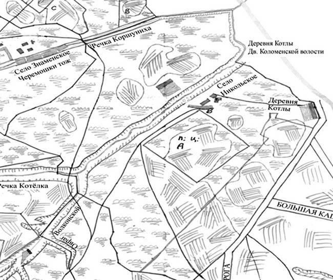 А под литерой К-43 – план дачи, образовавшейся по специальному межеванию под названием «части деревни Котлов» владения статской советницы Елены Фёдоровой Андреевой, расположенной широкой полосой вдоль Серпуховской дороги и включавшей земли полдеревни Котлы и полдеревни Евстратьевой. «А внутри того владения… земли состоит пашенной 33 дес. 2160 кв. саж., сенного покосу 22 дес. 1200 кв. саж., лесу строевого и дровяного 3 дес. 1000 кв. саж., под поселением, огородами, гуменниками, коноплянниками и садами 7 дес. 1500 кв. саж., под полупрудом 480 кв. саж., под проселочною дорогою 620 кв. саж. А всего во всей окружной меже удобной и неудобной земли 67 дес. 2160 кв. саж., а за исключением неудобных мест осталось одной удобной земли 67 дес. 1060 кв. саж. В деревне Котлах за вышеписанною владелицею состоит крестьянских дворов 6, в них по ревизии и ныне их налицо мужеска и женска пола по 28 душ»31.