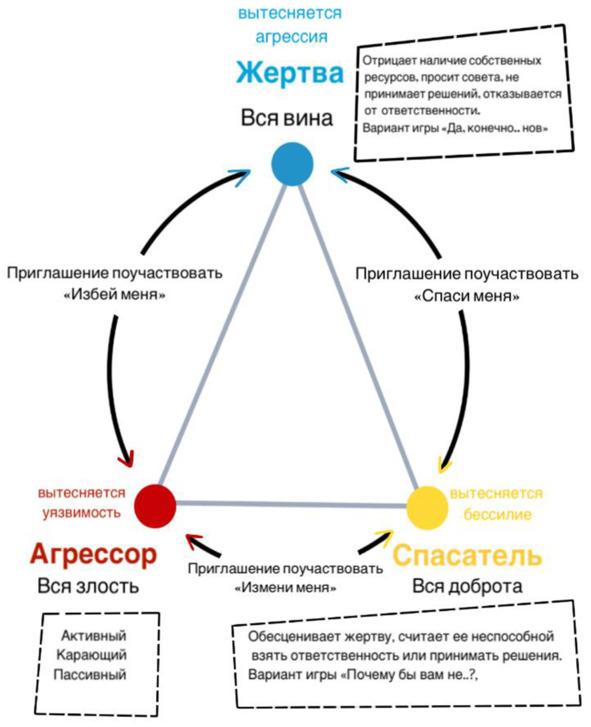 Однако, если взрослые люди не достигли психологической автономии, они не проживают свою жизнь полноценно, а играют в ней роли. Эти роли создают созависимости, и в них попадают люди именно те, которые не до конца отделились от родительской фигуры и не могут преодолеть этапы созависимости и контразависимости. Такими ролями являются: жертва, агрессор, спасатель. Эти роли образуют так называемый треугольник Карпмана (драматический треугольник), который показывает динамику взаимоотношений. Участники в этой схеме могут меняться местами (см. схему «Треугольник Карпмана»).