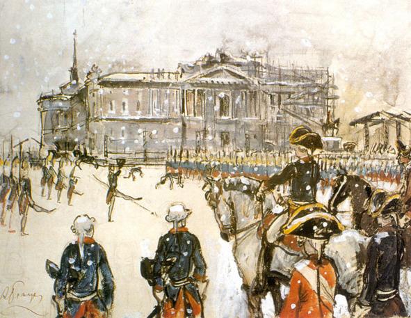 На очень холодной площади в декабре месяце тысяча восемьсот двадцать пятого года перестали существовать люди двадцатых годов с их прыгающей походкой. Время вдруг переломилось; раздался вдруг хруст костей у Михайловского манежа — восставшие бежали по телам товарищей…
