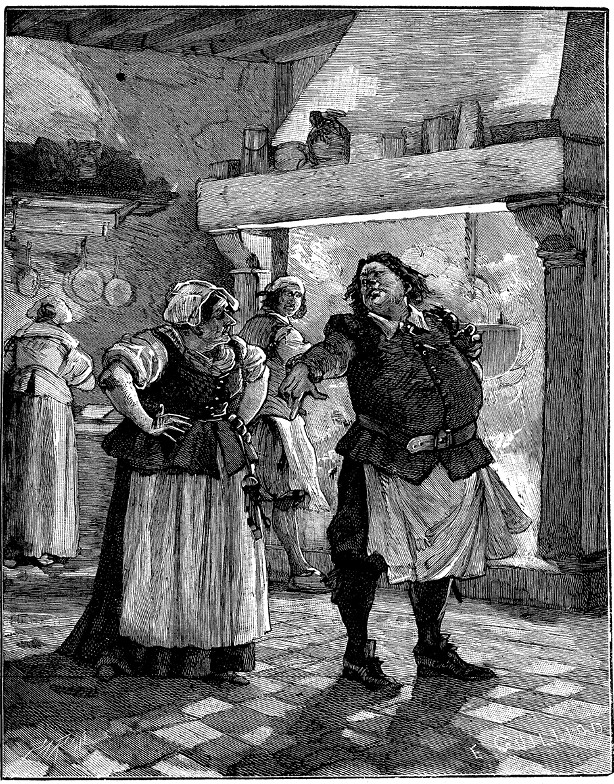 Незнакомец же, прежде чем исчезнуть из кухни, с притворным равнодушием следил за всеми передвижениями трактирщика и, как только тот вышел, чтобы впустить приезжих, бросил кошелек, полный золота, поварам, приложил палец к губам в знак молчания и, закутавшись в плащ, вышел через другую дверь.