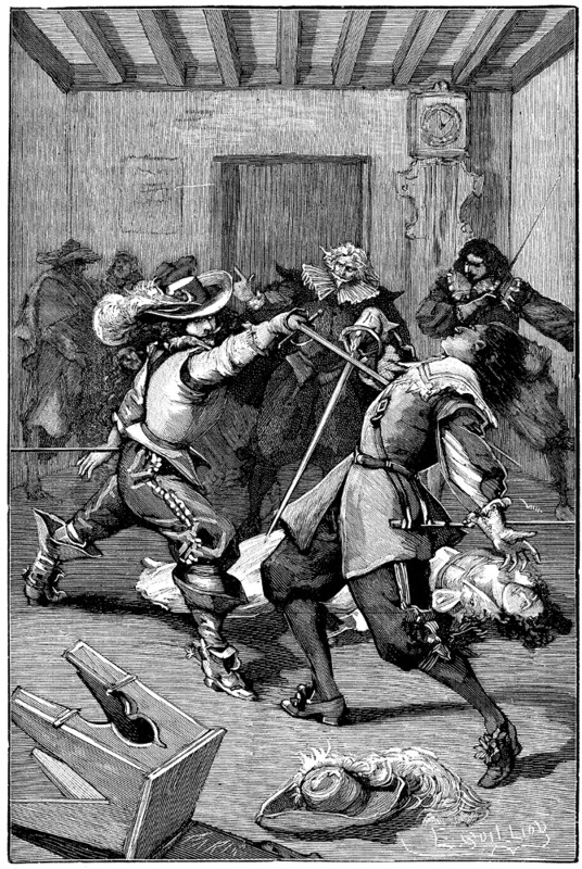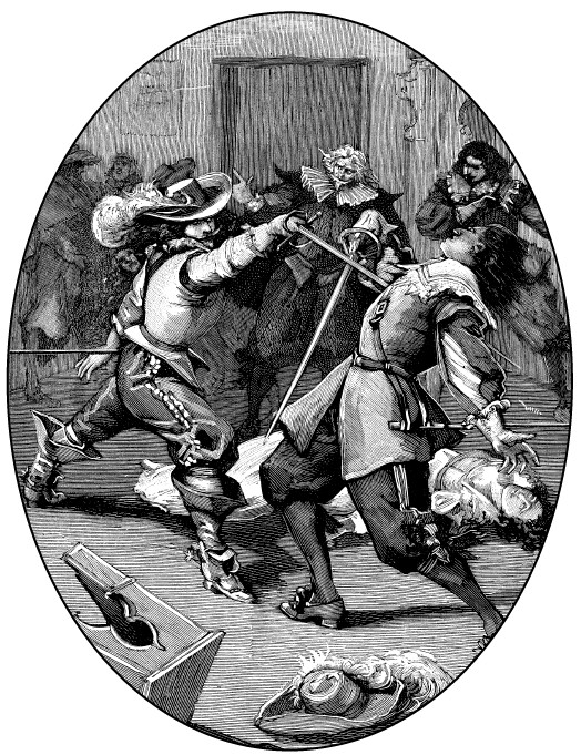 Братья, оставив сестру, почти лишившуюся чувств, устремились к графу, бросив ему в лицо перчатки и обнажив шпаги. Это было смертельным оскорблением. Граф страшно побледнел и также обнажил шпагу. Слуги, опасаясь матросов, пришедших вместе с графом де Бармоном, не предпринимали попыток вмешаться. Тогда герцог встал между тремя молодыми людьми, готовыми вступить в бой.