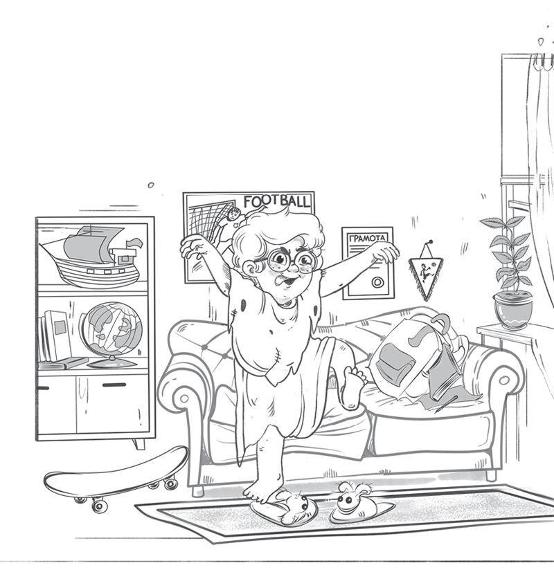 Вовка запрыгнул на мой диван, выставил вперёд руки, немного приподнял правую босую ногу – типа он шагает: