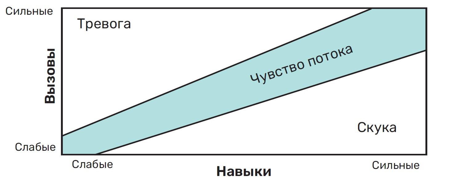 И, как мы видим, не такой уж широкий у нас туннель состояния потока, где есть возможность чувствовать себя счастливым, благополучным и реализованным, когда наши ресурсы и навыки уравновешиваются вызовами. Причем обратите внимание: если мало навыков, недостаточно внутреннего ресурса, то и размах вызовов, с которыми вы можете справиться, будет ограниченным. Но тренировка и адаптация в том и заключаются, что шаг за шагом мы постепенно развиваем свои навыки — как профессиональные, так и социальные, психологические — и становимся готовыми к встрече с более масштабными вызовами, которые стимулируют дальнейший рост и развитие. Состоянию потока можно найти объяснения и с точки зрения нейробиологии: адреналин и норадреналин помогают преодолевать трудности, обучаться, достигать новых высот, ведь на любые свершения нужна энергия и активность; а с другой стороны, мы испытываем предвкушение удовольствия и положительные эмоции от достижений — и это ощущение счастья нам дарят дофаминовая и серотониновая системы мозга. В результате возникает чувство потока, ощущение легкости, несмотря на затрачиваемые усилия и труд.