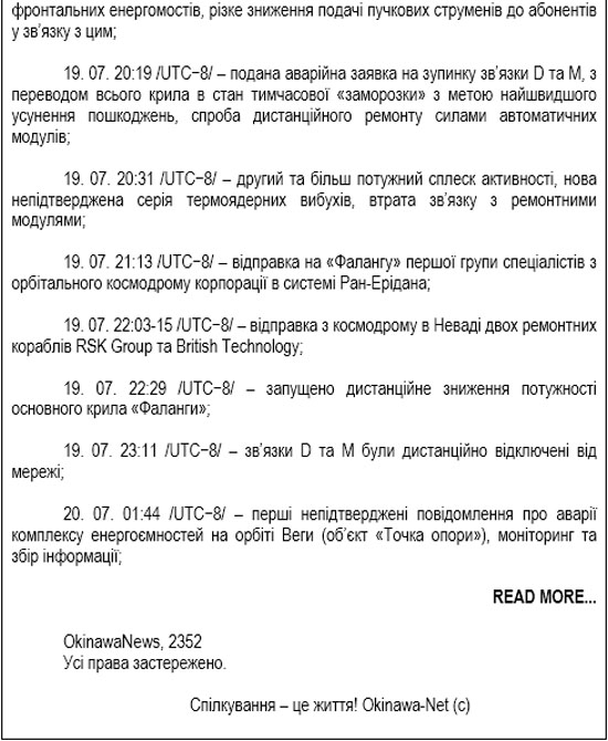 12 год. UTC—8 /Repost for… «@DailyTelegraph»/ — Прес-служба корпорації RSK Group офіційно заявляє, що масштабні аварії одразу кількох енергоємностей навколо ряду віддалених одна від одної зірок ніяк не пов’язані з активністю терористів. Зокрема, представники компанії заявляють, що катастрофи викликало одночасне і аномально різке зростання зоряної активності, а не техногенні фактори, як припускалось раніше, і нині питання вивчається відповідним підкомітетом уряду ООН. Було також повідомлено про заключну стадію екстрено-примусових ремонтних робіт енергоємностей Тау Кита, аварія котрих тиждень тому призвела до тотальної паніки на міжнародних фондових ринках. Нагадаємо, що тоді в мас-медіа ширилися непідтверджені чутки про низку терористичних атак одразу на кілька надпотужних об’єктів RSK Group. Корпорація ще раз спростувала ці повідомлення та запевнила, що вже найближчими днями їхні спеціалісти спільно з консультантами British Technology перейдуть до циклу випробувань та налагодження технологічних систем навкруг неспокійної зорі. Також прес-службою було заявлено про достатній рівень власних потужностей задля забезпечення енерг
